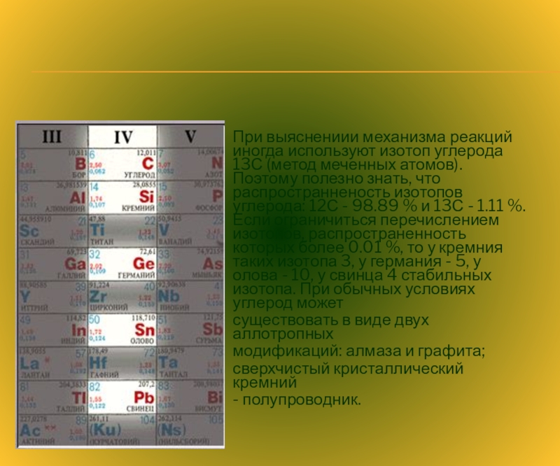 При выяснениии механизма реакций иногда используют изотоп углерода 13С (метод меченных атомов). Поэтому полезно знать, что распространненость изотопов углерода: 12С - 98.89 % и 13С - 1.11 %. Если ограничиться перечислением изотопов, распространенность которых более 0.01 %, то у кремния таких изотопа 3, у германия - 5, у олова - 10, у свинца 4 стабильных изотопа. При обычных условиях углерод может