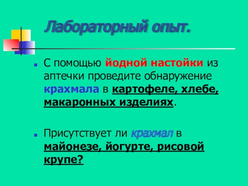 С помощью йодной настойки из аптечки проведите обнаружение крахмала в