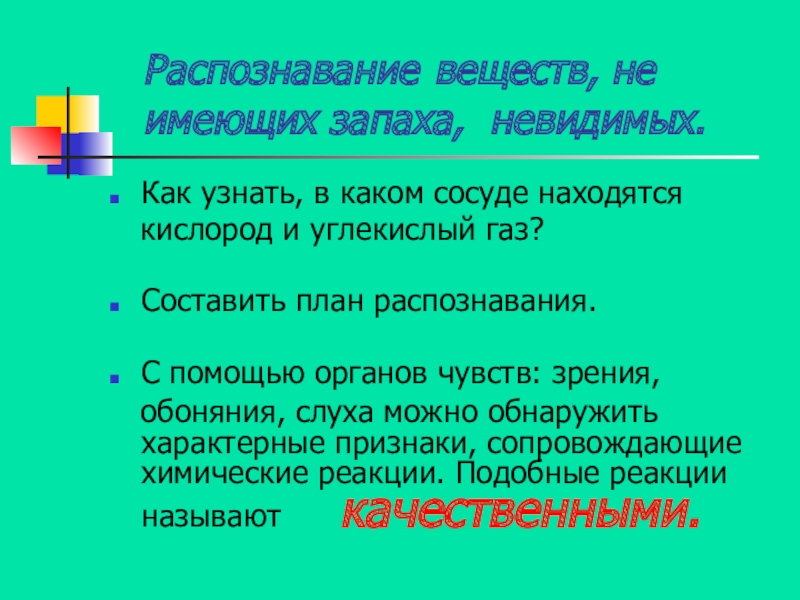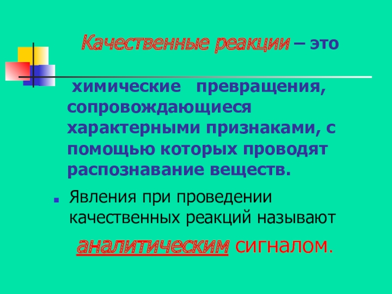 обоняния, слуха можно обнаружить характерные признаки, сопровождающие химические реакции. Подобные реакции называют качественными.
