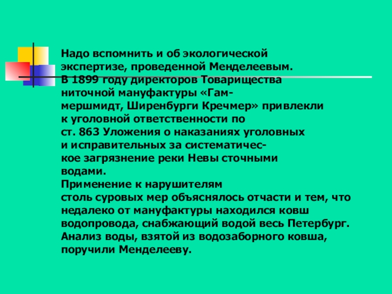 Актуально звучат работы Менделеева по сточным водам. Особый интерес представляет заключение Менделеева по делу о загрязнении вод Невы сточными водами Невской ниточной мануфактуры.