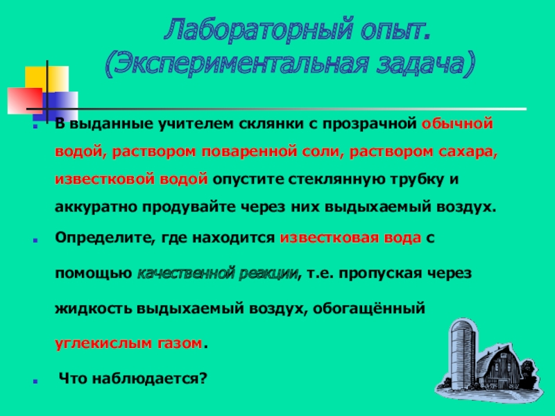 Определите, где находится известковая вода с помощью качественной реакции, т.е. пропуская через жидкость выдыхаемый воздух, обогащённый углекислым газом.