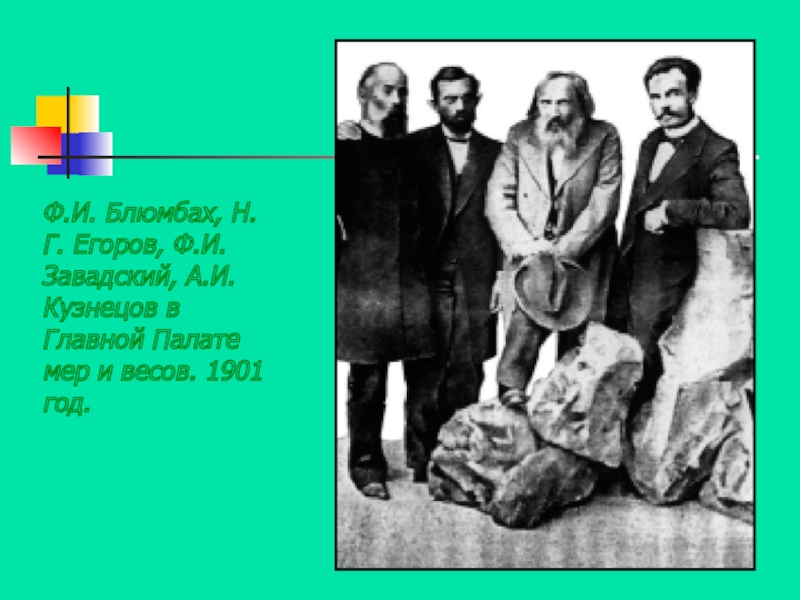 Слайд 29Ф.И. Блюмбах, Н.Г. Егоров, Ф.И. Завадский, А.И.Кузнецов в Главной Палате мер