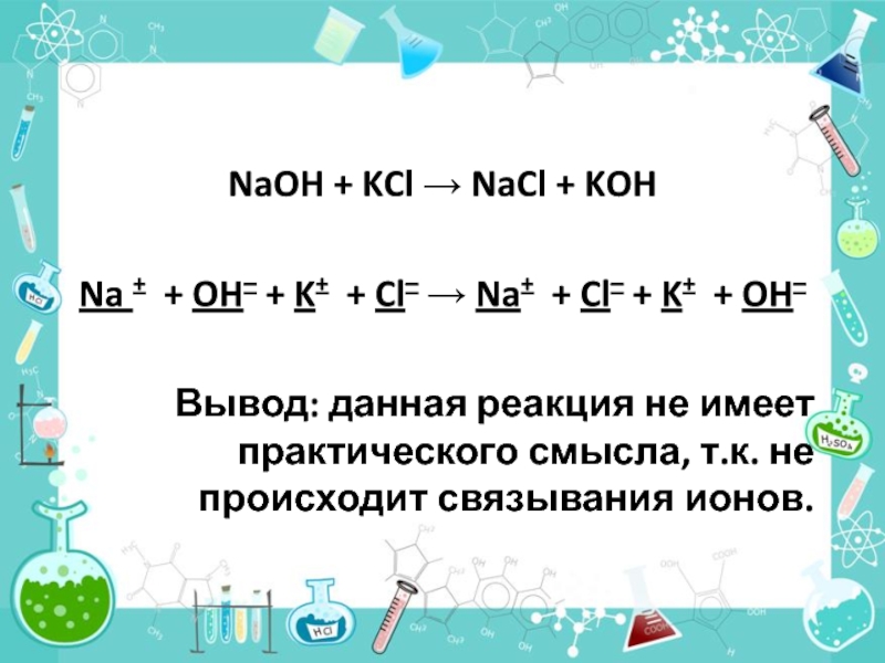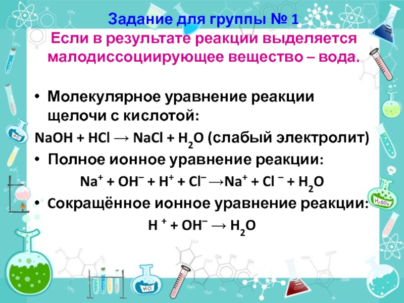 NaOH + HCl → NaCl + H2O (слабый электролит)