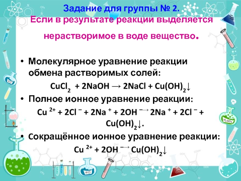 Cu 2+ + 2Cl – + 2Na + + 2OH –→ 2Na + + 2Cl – + Cu(OH)2↓.