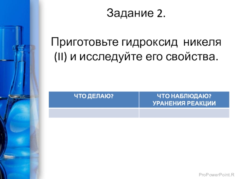 Слайд 9 Задание 2. Приготовьте гидроксид никеля (II) и исследуйте его свойства.