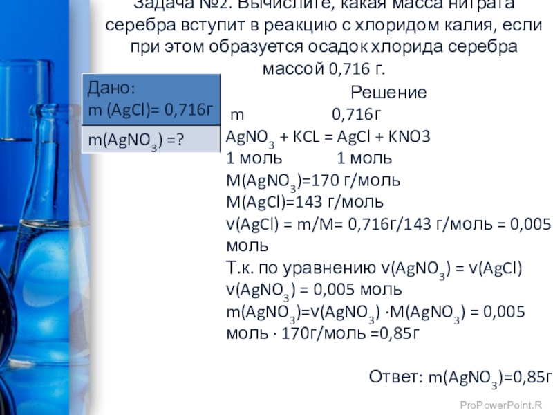 m(AgNO3)=ν(AgNO3) ∙M(AgNO3) = 0,005моль ∙ 170г/моль =0,85г