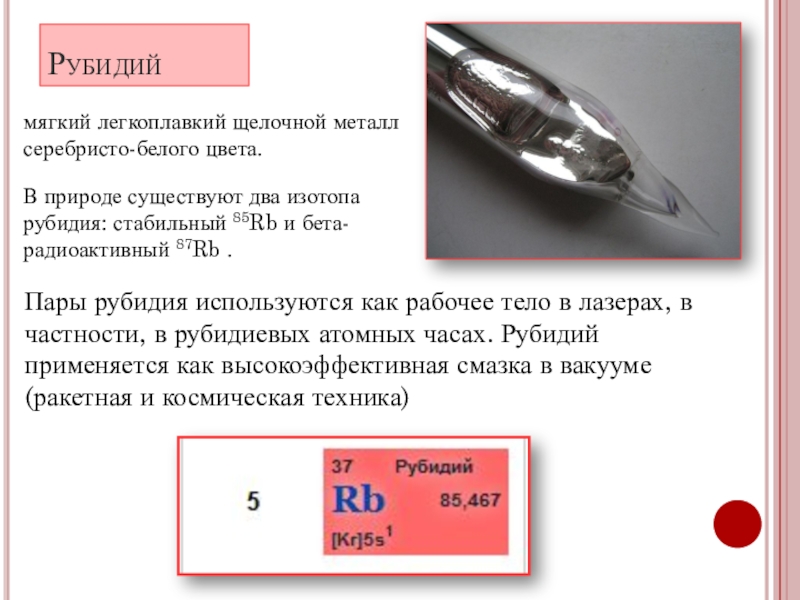 Пары рубидия используются как рабочее тело в лазерах, в частности, в рубидиевых атомных часах. Рубидий применяется как высокоэффективная смазка в вакууме (ракетная и космическая техника)