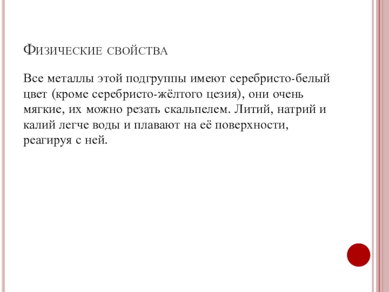 Цезий — мягкий металл, из-за низкой температуры плавления (Tпл=28,6 °C) при комнатной температуре находится в полужидком состоянии.