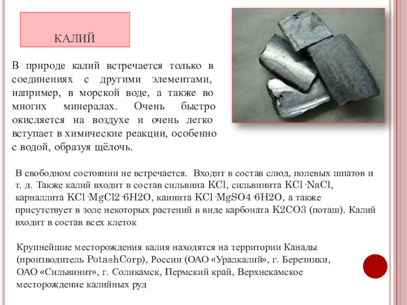 В свободном состоянии не встречается. Входит в состав слюд, полевых шпатов и т. д. Также калий входит в состав сильвина KCl, сильвинита KCl·NaCl, карналлита KCl·MgCl2·6H2O, каинита KCl·MgSO4·6H2O, а также присутствует в золе некоторых растений в виде карбоната K2CO3 (поташ). Калий входит в состав всех клеток