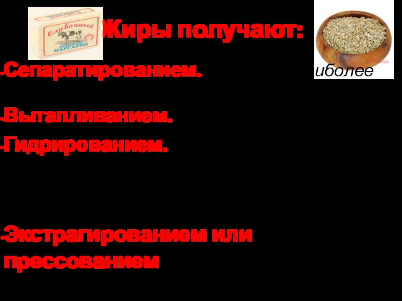 Жиры получают вытапливанием, сепарированием, гидрированием, прессованием или экстрагированием.