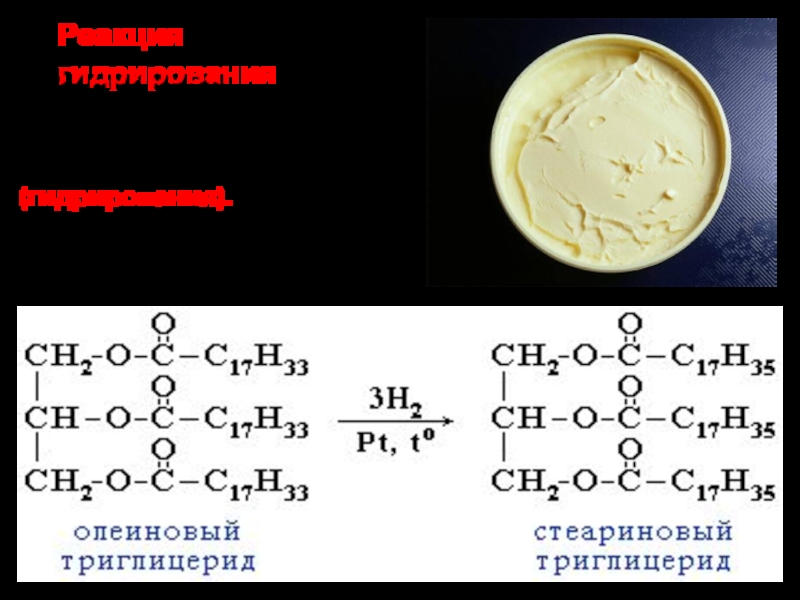 Слайд 22 Жидкие жиры превращают в твердые путем реакции гидрогенизации (гидрирования).