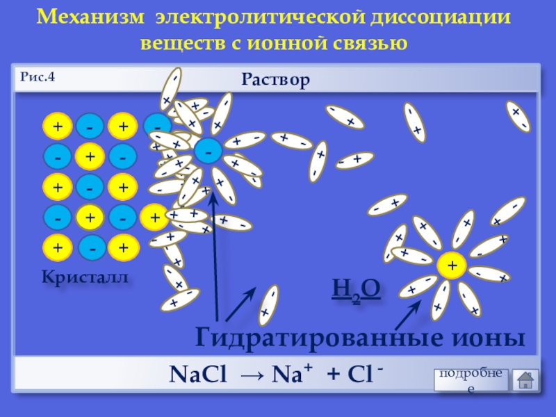 Диссоциация(распад) молекул электролита на гидратированные ионы.