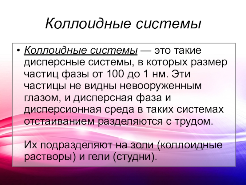Коллоидные системы — это такие дисперсные системы, в которых размер