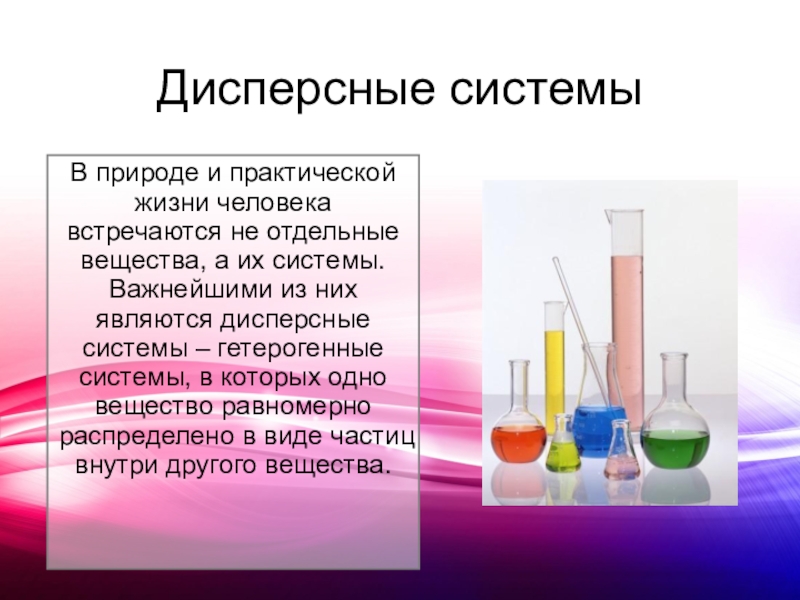 а их системы. Важнейшими из них являются дисперсные системы – гетерогенные системы, в которых одно вещество равномерно распределено в виде частиц внутри другого вещества.