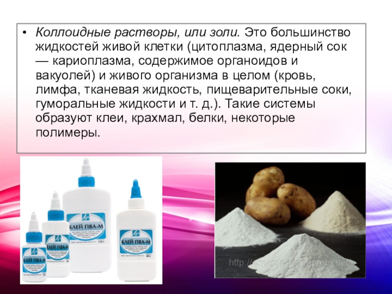 — кариоплазма, содержимое органоидов и вакуолей) и живого организма в целом (кровь, лимфа, тканевая жидкость, пищеварительные соки, гуморальные жидкости и т. д.). Такие системы образуют клеи, крахмал, белки, некоторые полимеры.