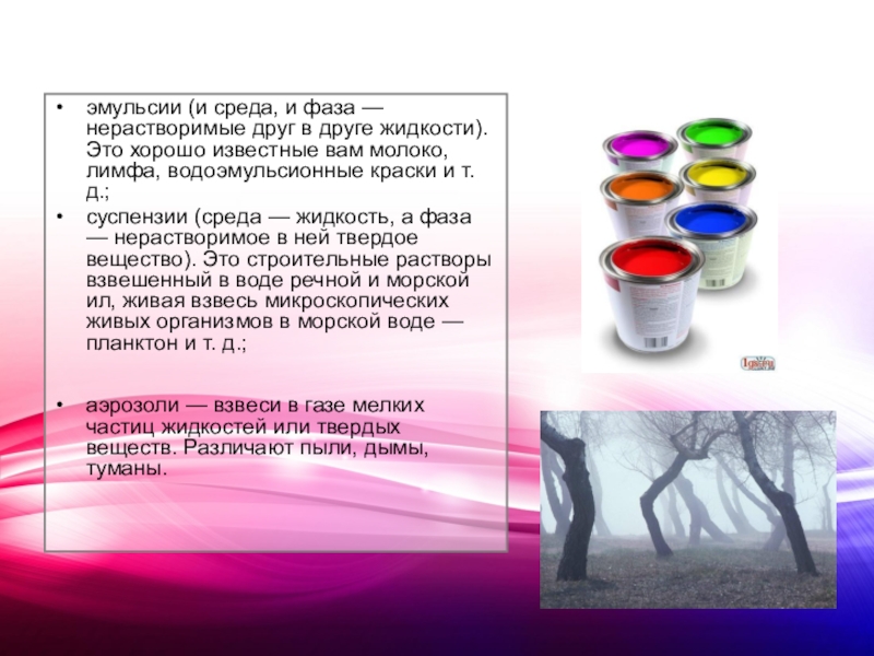 Слайд 7эмульсии (и среда, и фаза — нерастворимые друг в друге жидкости).