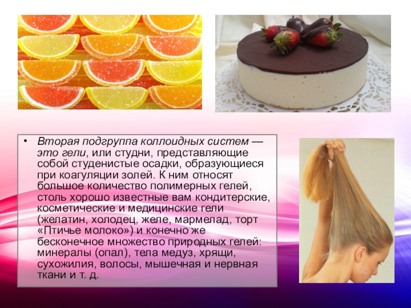 студенистые осадки, образующиеся при коагуляции золей. К ним относят большое количество полимерных гелей, столь хорошо известные вам кондитерские, косметические и медицинские гели (желатин, холодец, желе, мармелад, торт «Птичье молоко») и конечно же бесконечное множество природных гелей: минералы (опал), тела медуз, хрящи, сухожилия, волосы, мышечная и нервная ткани и т. д.