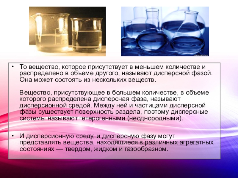 другого, называют дисперсной фазой. Она может состоять из нескольких веществ.