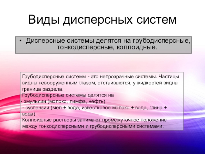 Дисперсные системы делятся на грубодисперсные, тонкодисперсные, коллоидные.