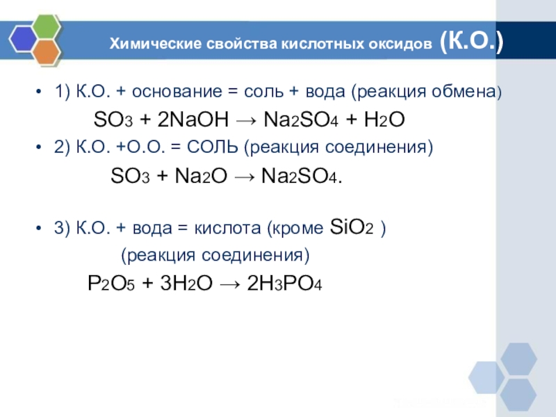 Слайд 9Химические свойства кислотных оксидов (К.О.)