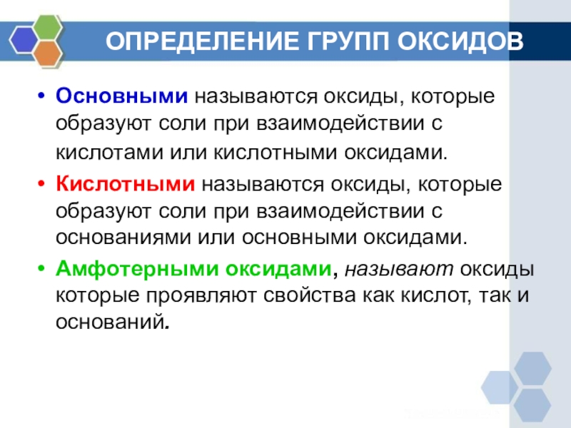 ОПРЕДЕЛЕНИЕ ГРУПП ОКСИДОВОсновными называются оксиды, которые образуют соли при взаимодействии с кислотами или кислотными оксидами. Кислотными называются