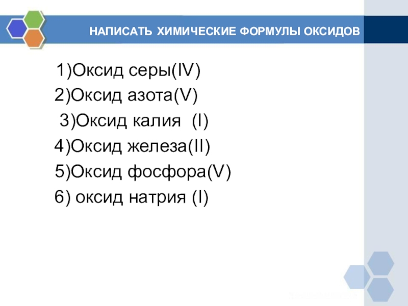Слайд 4НАПИСАТЬ ХИМИЧЕСКИЕ ФОРМУЛЫ ОКСИДОВ