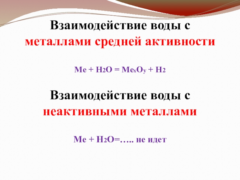 Взаимодействие воды с  металлами средней активностиMe + H2O = MexOy + H2Взаимодействие воды с неактивными металламиMe