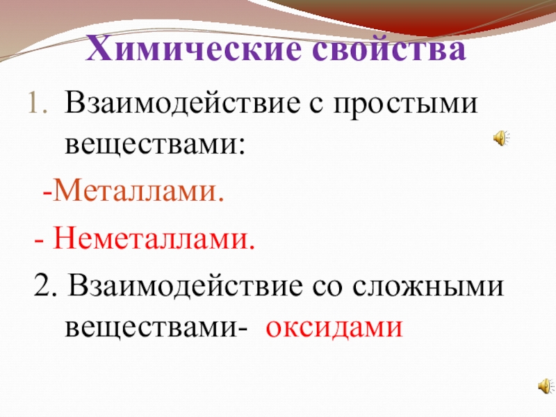 Химические свойстваВзаимодействие с простыми веществами: -Металлами.- Неметаллами.2. Взаимодействие со сложными веществами- оксидами