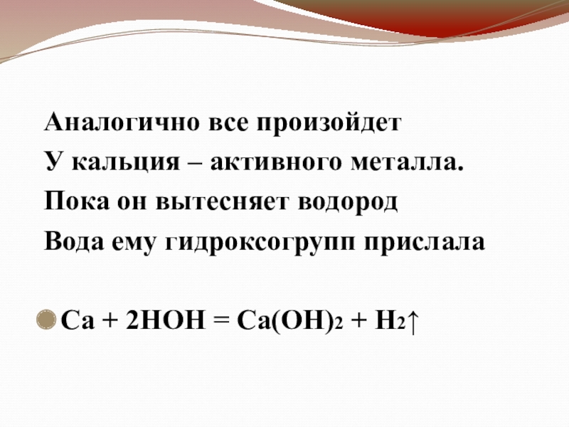 Аналогично все произойдет У кальция – активного металла.Пока он вытесняет водородВода ему гидроксогрупп прислалаCa + 2HOH =