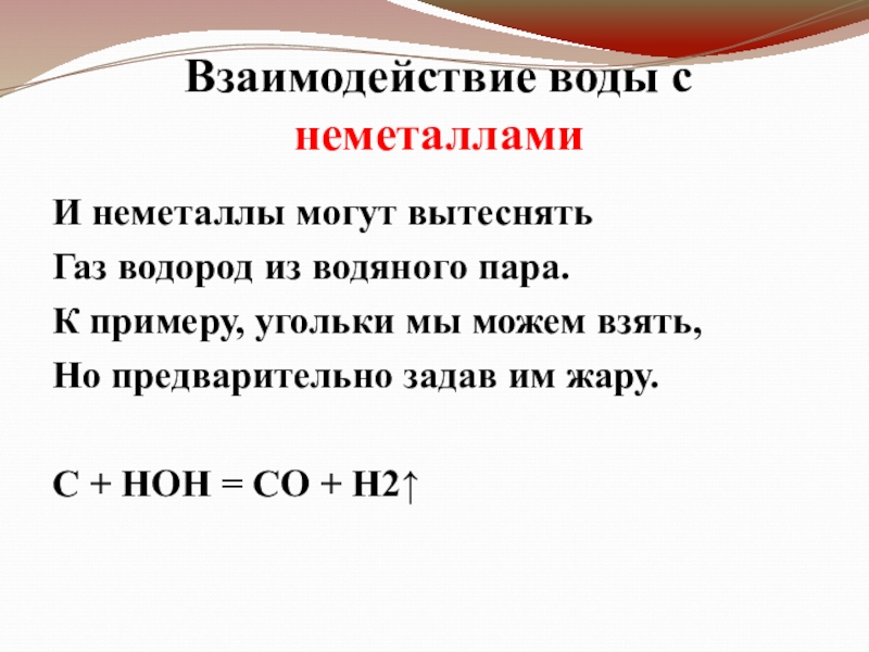 Взаимодействие воды с неметалламиИ неметаллы могут вытеснять Газ водород из водяного пара.К примеру, угольки мы можем взять,