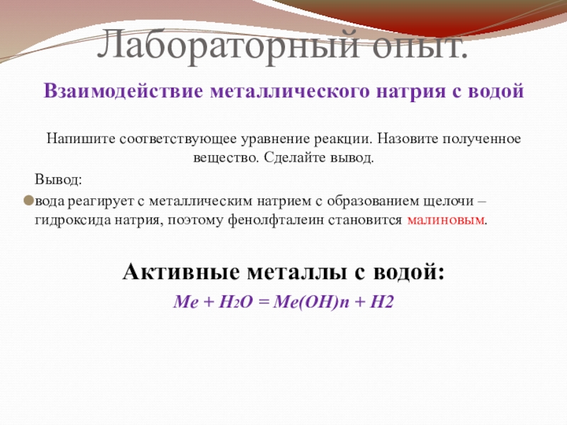 Лабораторный опыт.  Взаимодействие металлического натрия с водойНапишите соответствующее уравнение реакции. Назовите полученное вещество. Сделайте вывод.Вывод: вода