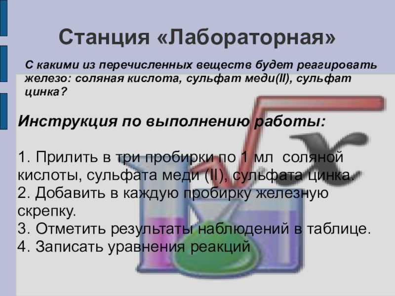 1. Прилить в три пробирки по 1 мл соляной кислоты, сульфата меди (II), сульфата цинка.
