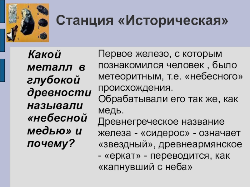 Первое железо, с которым познакомился человек , было метеоритным, т.е. «небесного» происхождения. Обрабатывали его так же, как медь.