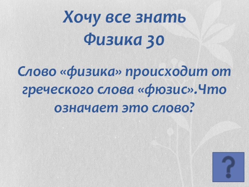 Хочу все знать Физика 30Слово «физика» происходит от греческого слова «фюзис».Что означает это слово?