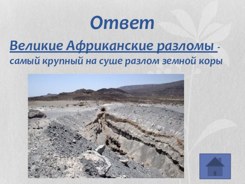 ОтветВеликие Африканские разломы - самый крупный на суше разлом земной коры