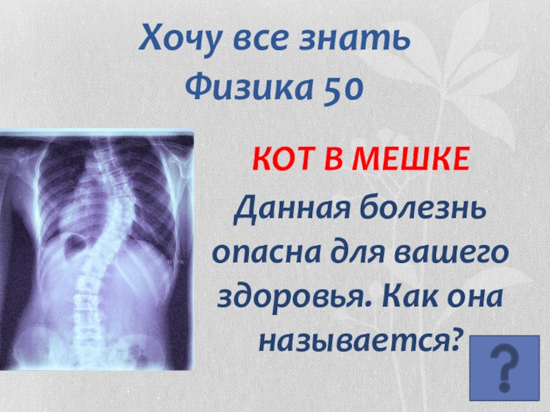 Хочу все знать Физика 50КОТ В МЕШКЕДанная болезнь опасна для вашего здоровья. Как она называется?