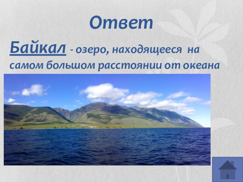 ОтветБайкал - озеро, находящееся на самом большом расстоянии от океана
