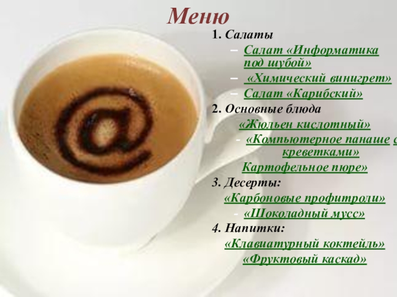 Меню1. СалатыСалат «Информатика под шубой» «Химический винигрет»Салат «Карибский» 2. Основные блюда «Жюльен кислотный» «Компьютерное панаше с креветками» Картофельное пюре» 3. Десерты: «Карбоновые профитроли» «Шоколадный мусс»4. Напитки: «Клавиатурный коктейль»«Фруктовый каскад»