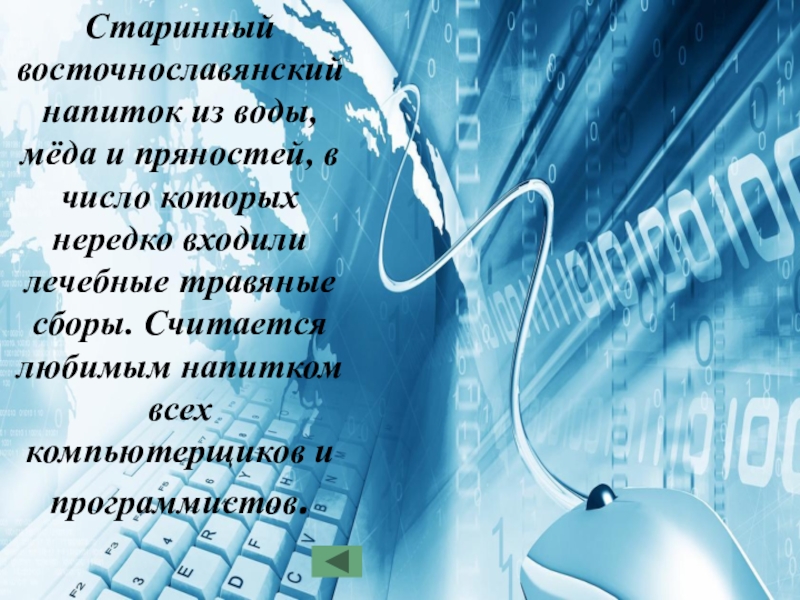 Слайд 11Старинный восточнославянский напиток из воды, мёда и пряностей, в число которых