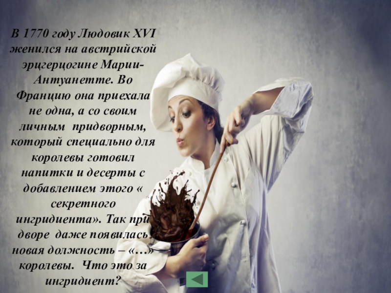 Францию она приехала не одна, а со своим личным придворным, который специально для королевы готовил напитки и десерты с добавлением этого « секретного ингридиента». Так при дворе даже появилась новая должность – «…» королевы. Что это за ингридиент?