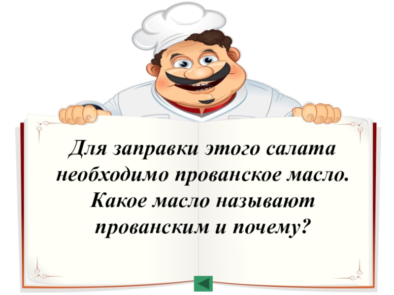Слайд 5Для заправки этого салата необходимо прованское масло. Какое масло называют прованским