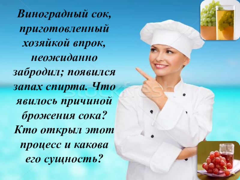 Слайд 12Виноградный сок, приготовленный хозяйкой впрок, неожиданно забродил; появился запах спирта. Что