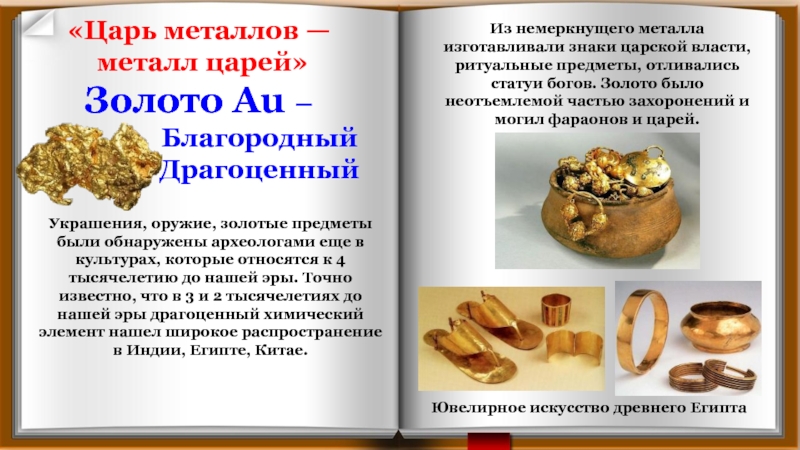 Из немеркнущего металла изготавливали знаки царской власти, ритуальные предметы, отливались статуи богов. Золото было неотъемлемой частью захоронений и могил фараонов и царей.