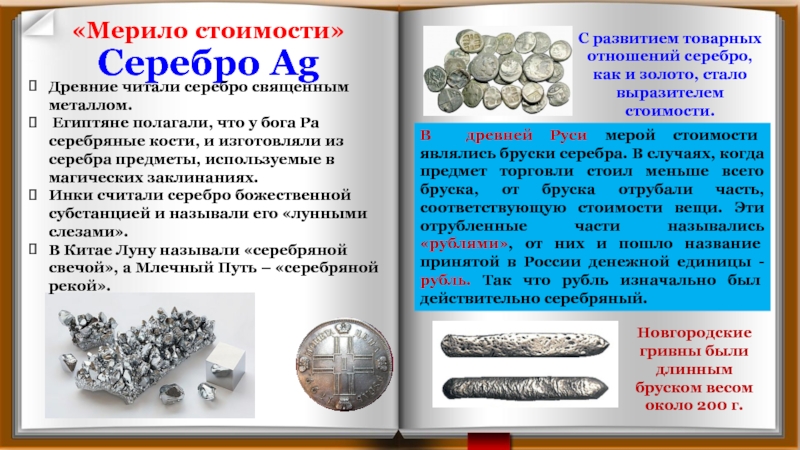 В древней Руси мерой стоимости являлись бруски серебра. В случаях, когда предмет торговли стоил меньше всего бруска, от бруска отрубали часть, соответствующую стоимости вещи. Эти отрубленные части назывались «рублями», от них и пошло название принятой в России денежной единицы - рубль. Так что рубль изначально был действительно серебряный.