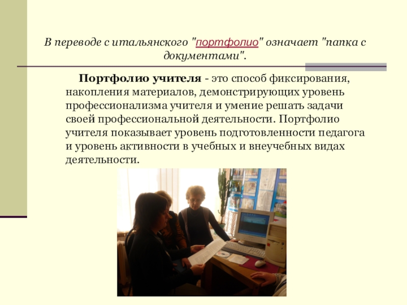 Слайд 2В переводе с итальянского "портфолио" означает "папка с документами".