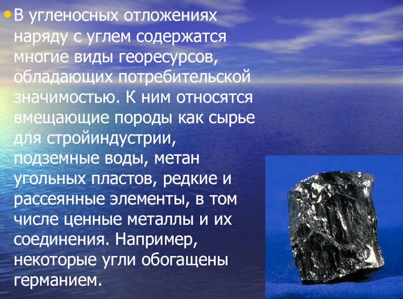 Слайд 17В угленосных отложениях наряду с углем содержатся многие виды георесурсов, обладающих