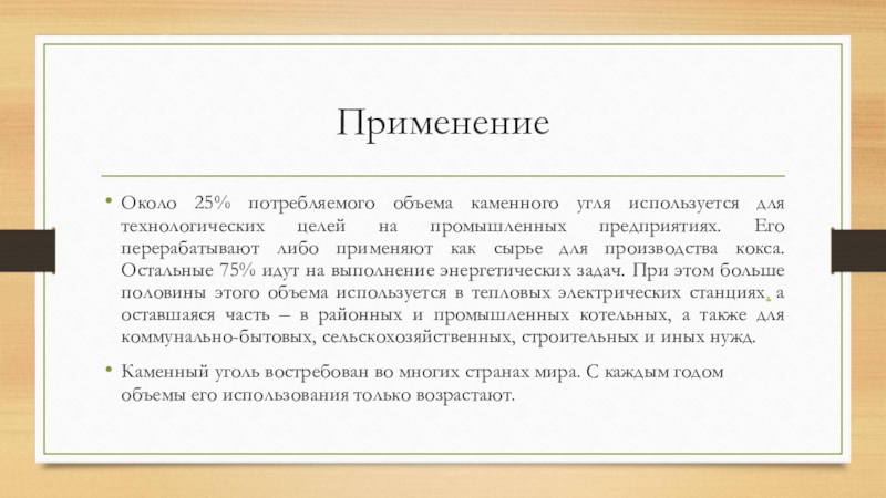 промышленных предприятиях. Его перерабатывают либо применяют как сырье для производства кокса. Остальные 75% идут на выполнение энергетических задач. При этом больше половины этого объема используется в тепловых электрических станциях, а оставшаяся часть – в районных и промышленных котельных, а также для коммунально-бытовых, сельскохозяйственных, строительных и иных нужд.