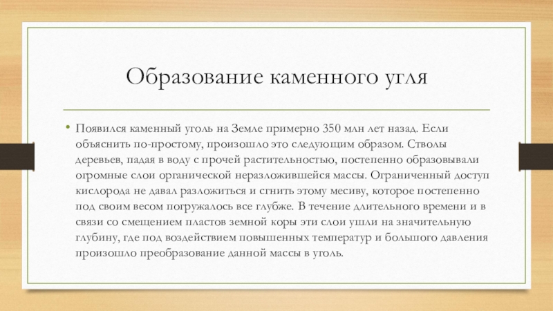 назад. Если объяснить по-простому, произошло это следующим образом. Стволы деревьев, падая в воду с прочей растительностью, постепенно образовывали огромные слои органической неразложившейся массы. Ограниченный доступ кислорода не давал разложиться и сгнить этому месиву, которое постепенно под своим весом погружалось все глубже. В течение длительного времени и в связи со смещением пластов земной коры эти слои ушли на значительную глубину, где под воздействием повышенных температур и большого давления произошло преобразование данной массы в уголь.
