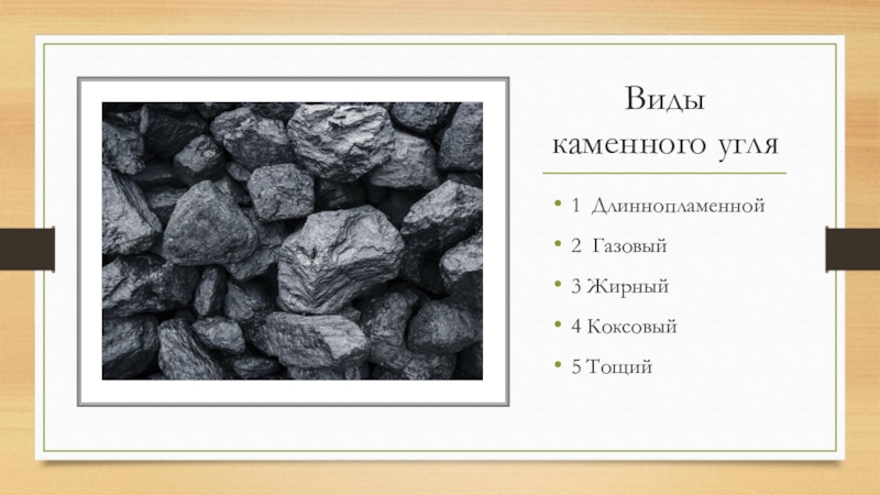 Виды каменного угля1  Длиннопламенной2  Газовый3 Жирный4 Коксовый5 Тощий