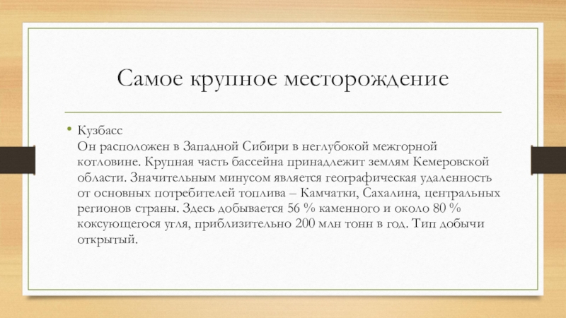 ЗаключениеНа земле существует множество месторождений угля , активно работающих по сей день. Уголь является одним из важнейших